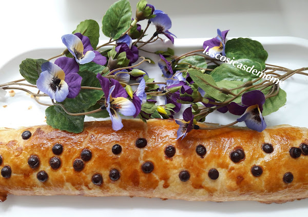 - 1 lámina de hojaldre, nocilla, nutela o similar, un poco de harina, 1 huevo para pintar, 2 cucharadas soperas de azúcar, 1/2vaso de agua, fideos de chocolate.