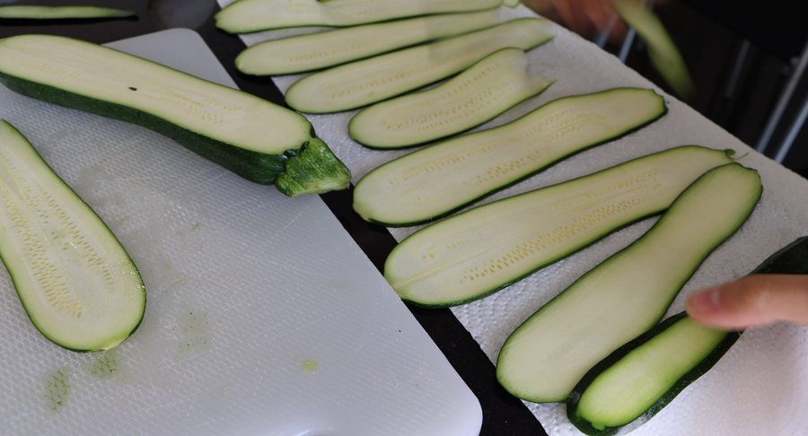 1. Cortar el calabacín en lonchas finas de 4 mm de grosor. Extender sobre papel y tapar con otro papel para que absorba el exceso de líquido.