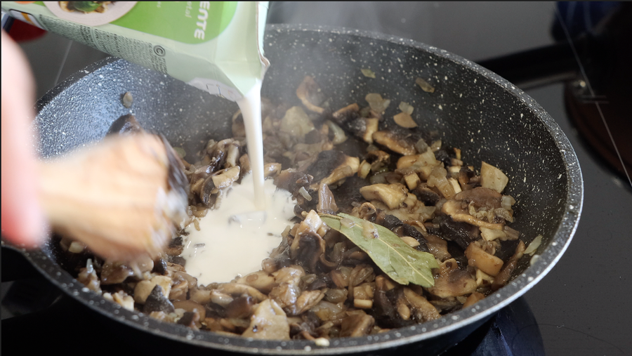 2. Preparar el relleno. Freír la cebolla y el ajo en aceite hasta que estén dorados. Agregue los champiñones picados y la hoja de laurel. Cocine los champiñones durante 7 minutos y luego agregue la crema. Cocina por un par de minutos. Agregue sal y pimienta.