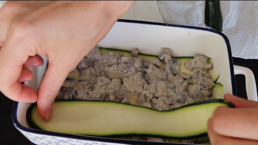 3. Ponga el calabacín en la forma. Sal. Luego la mitad del relleno. Más calabacín encima, luego rellenar y cubrir con calabacín. Rocíe con crema y espolvoree con queso. Cocinar a 200 gr hasta que esté dorado.