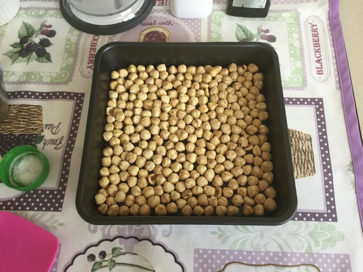 En una bandeja colocamos las avellanas y las ponemos dentro del horno para que al calentarse suelten su aceite. Notaréis que empiezan a brillar y también el olor a avellana tostada en toda la cocina, realmente apetecible pero no las vayáis a comer que las necesitamos. Importantísimo estar muy pendientes porque son delicadas y se nos pueden quemar. Así que fuera distracciones de la cocina. Van a ser sólo 10 minutos máximo.