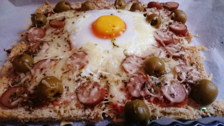 Se le ocurrió para una noche en la que no sabía a ciencia cierta que preparar. De repente se le ocurrió hacer una pizza, pero una pizza hecha en 10 minutos, sobre una base de pan de molde, por persona se calcula unas 4 rebanadas de pan de molde. tomate,triturado, salchichas tipo Frankfurt, orégano, queso para pizza, aceitunas rellenas de anchoas y un huevo. Se hace en el horno a 180 grados 10 minutos.