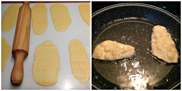 En una sartén, pon a calentar abundante aceite (unos 300 ml.). Una vez caliente, añade porciones de masa y fríe sin que lleguen a dorar demasiado. A mí me gusta que queden blanquitas. Ayúdate de dos tenedores para darles la vuelta.