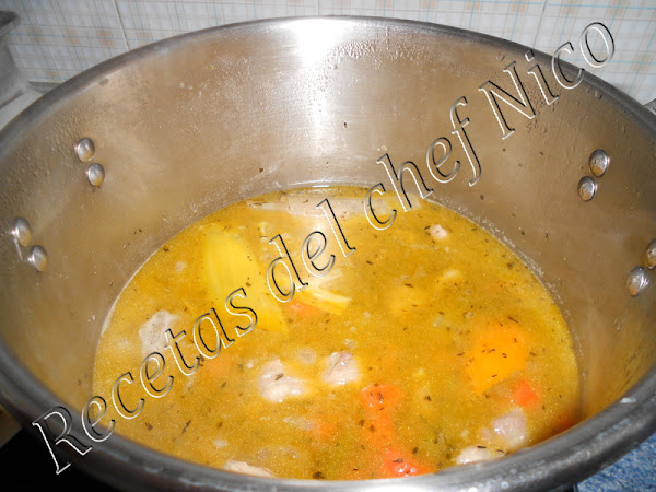6.Incorporamos la carne, tapa la cazuela y deja cocer durante 1 hora a fuego suave (en olla a presión dejaremos unos 20 minutos, abriremos la olla y añadiremos las patatas y volveremos a cocer otros 20 minutos). Añade las patatas y judías a mitad de cocción (yo las judías verdes las echo desde el principio porque me gustan muy hechas).