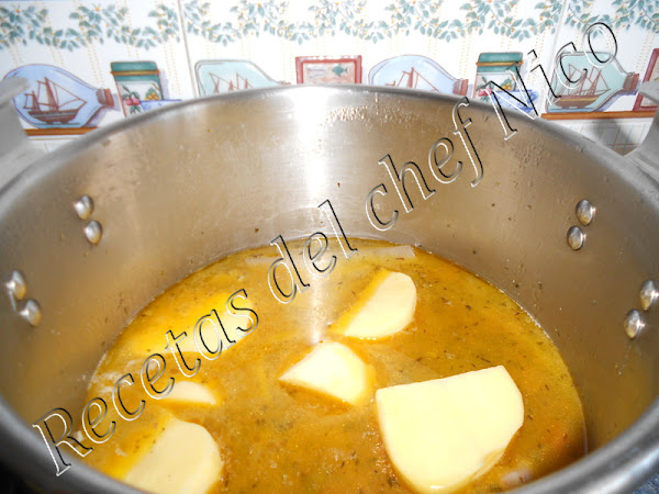 3.Pelamos las patatas y las cortamos a dados (a mi en particular me gustan en trozos grandes) y cortamos las judías a trozos (podemos usar las congeladas). Reservamos. Pelamos las zanahorias y cortamos en dados junto con el apio. Rehogamos las verduras (excepto las patatas que las añadimos luego) en la misma cazuela unos 10 minutos.