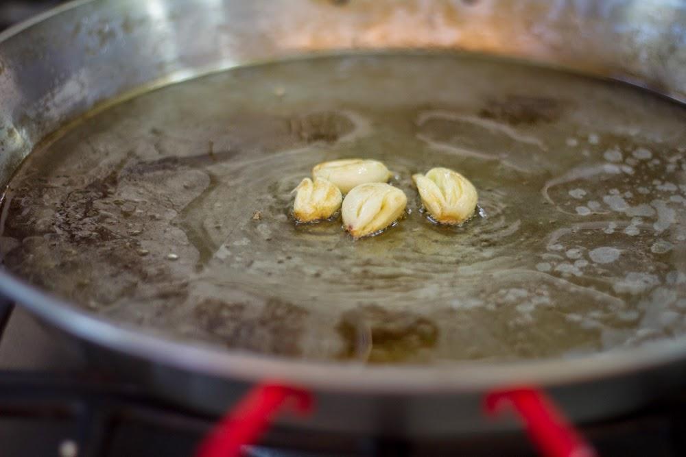 3.Calentar el aceite de oliva y dorar los ajos; retirarlos.
