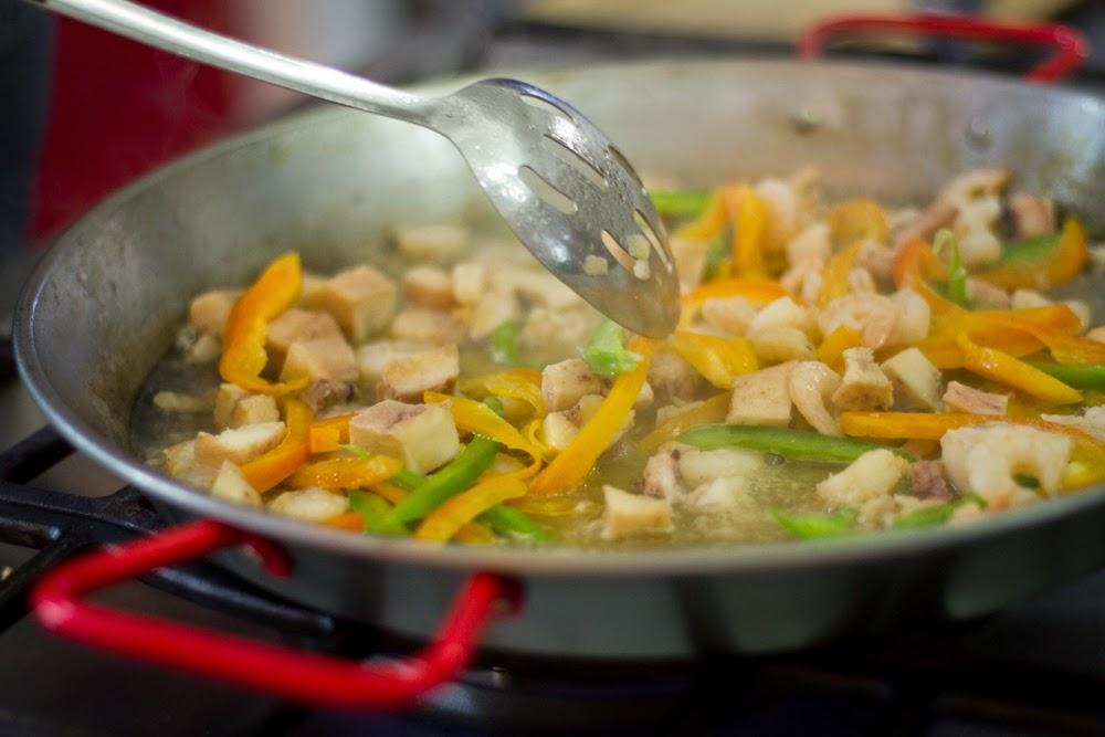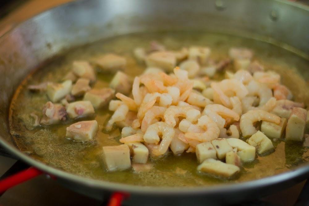 7. Añadir los calamares y los camarones de pacotilla, retirar y reservar.