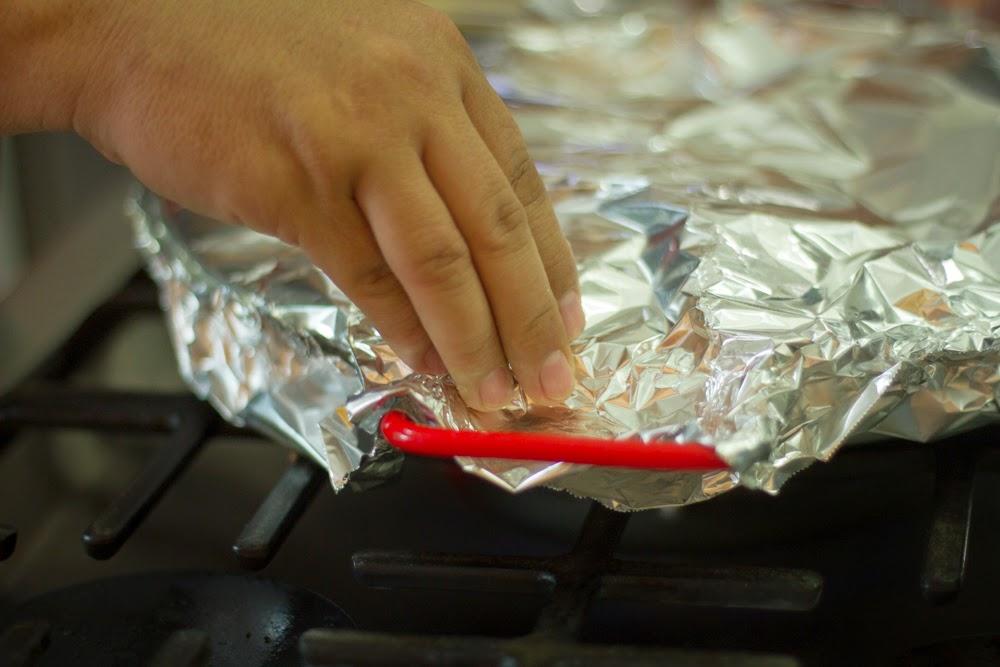 13. Cubrir con papel aluminio y poner un paño húmedo encima, se deja evaporizar a fuego bajo por aproximadamente 20 minutos.