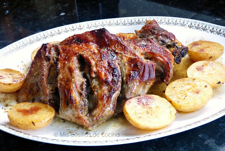 Introducimos en el horno precalentado a 200º una hora mas o menos dándole la vuelta de vez en cuando y regándola con su jugo.