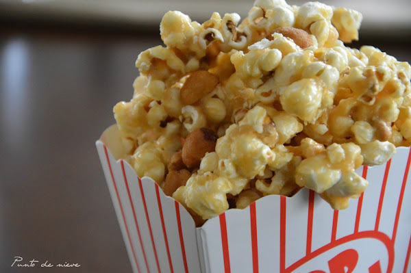 Ponemos en el fondo de la olla el aceite y 3 granos de maíz. Tapamos y dejamos que actúe el calor. Cuando salten las 3 palomitas, será el momento de echar el resto. Volvemos a tapar y dejamos que se hagan. Cuando ya no suenen los chasquidos de las palomitas al saltar, apagamos el fuego y, repartimos en dos boles.