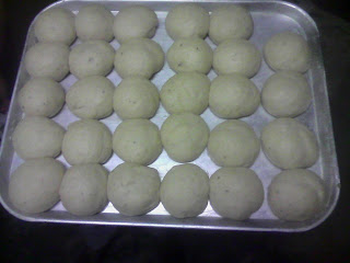 Retire la masa del bol y vuelva a amasar, corte trozos de unos 70 gramos, haga bolitas y coloque en bandejas, la bandeja debe estar previamente engrasada con manteca, deje levar por unos 10 o 15 minutos más.