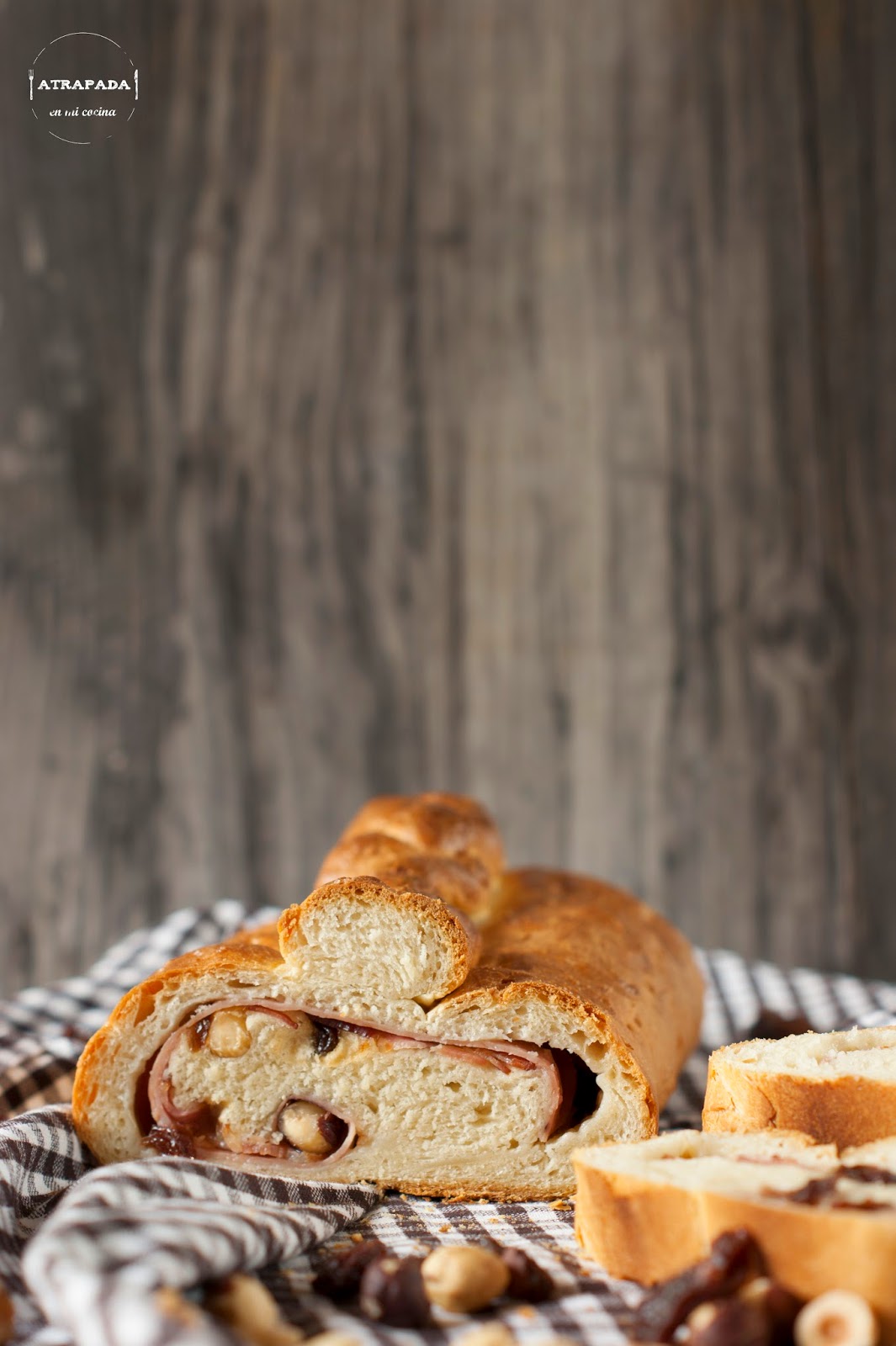 Transcurrida la hora estira la masa en forma de rectángulo sobre una superficie enharinada y ve colocando sobre esta las fetas de tocino, jamón cocido, las aceitunas verdes y las uvas pasas.
