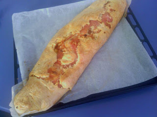 amasa unos 20 min y leva una hora y 15 min. saco de la máquina y golpeo un poco la masa para sacarle el aire, amaso apenas unos min, estiro con un rodillo y, pongo lochas de queso, de jamón o lo que halla elegido, enrollo y cierro los bordes mojando para que cierre bien.