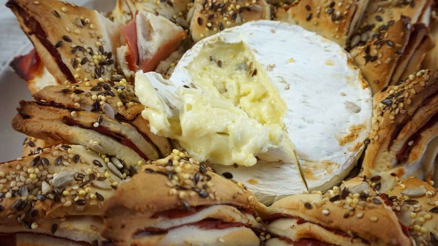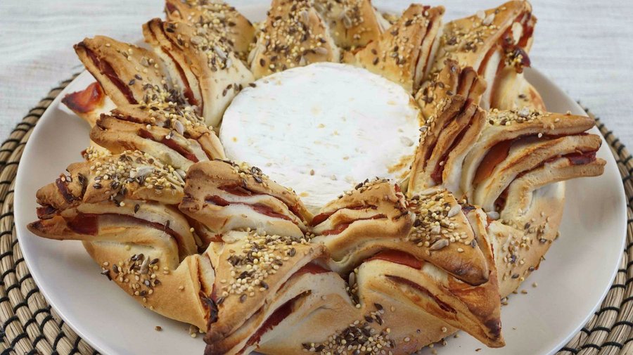 Ya solo nos quedará un pequeño agujero en el centro que cubriremos con un trocito o base fina,hecho con la masa sobrante,y colocaremos el camembert en el. Es mejor que el camembert esté a a temperatura ambiente para que sea más fácil de fundir. Ya solo nos queda pincelar la estrella con leche ,espolvorear con semillas y meterla en el horno unos 15-20 minutos o hasta que esté bien doradita y crujiente.