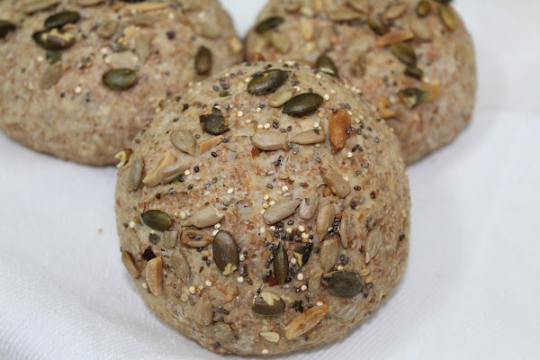 Desgasificamos la masa, armamos los panes (los unto con agua y le espolvoreo unas semillas por encima). Esperamos que leve otros 30 minutos.