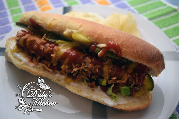 13- En el vídeo os muestro una de las formas en que nos gusta comerlos en casa. Se abren sin partirlos del todo y se unta mayonesa. Ponemos una capa de pepinillos laminados, lechuga cortada muy finita en juliana y queso. Se calienta la salchicha en agua hirviendo durante un minuto y se añade a nuestro pan. Es el momento de salsear, en nuestro caso mostaza y ketchup. Y por último cebolla frita. Riquísimos.