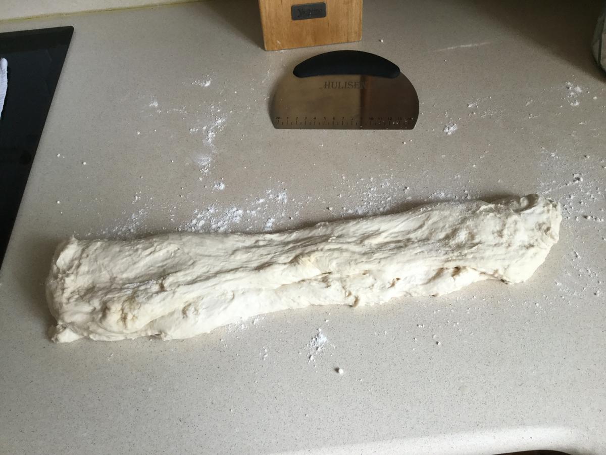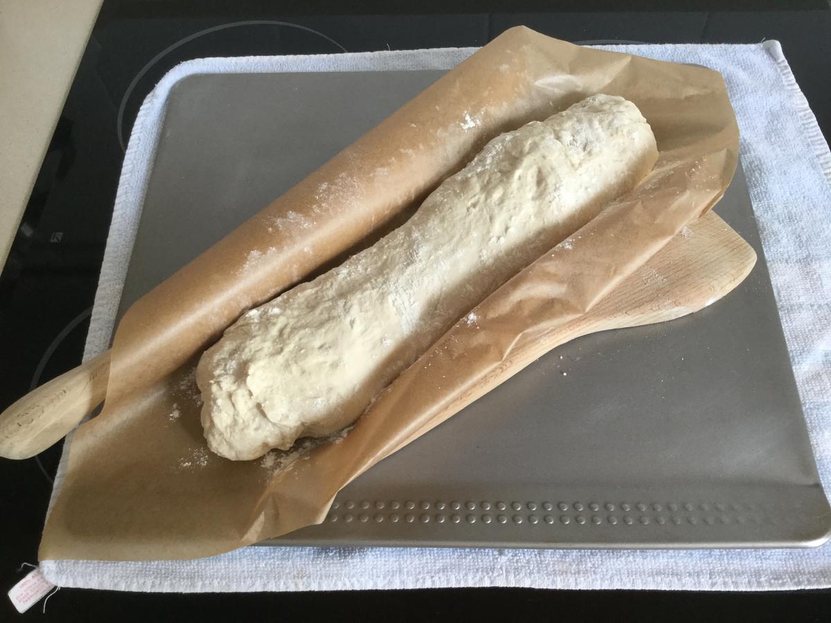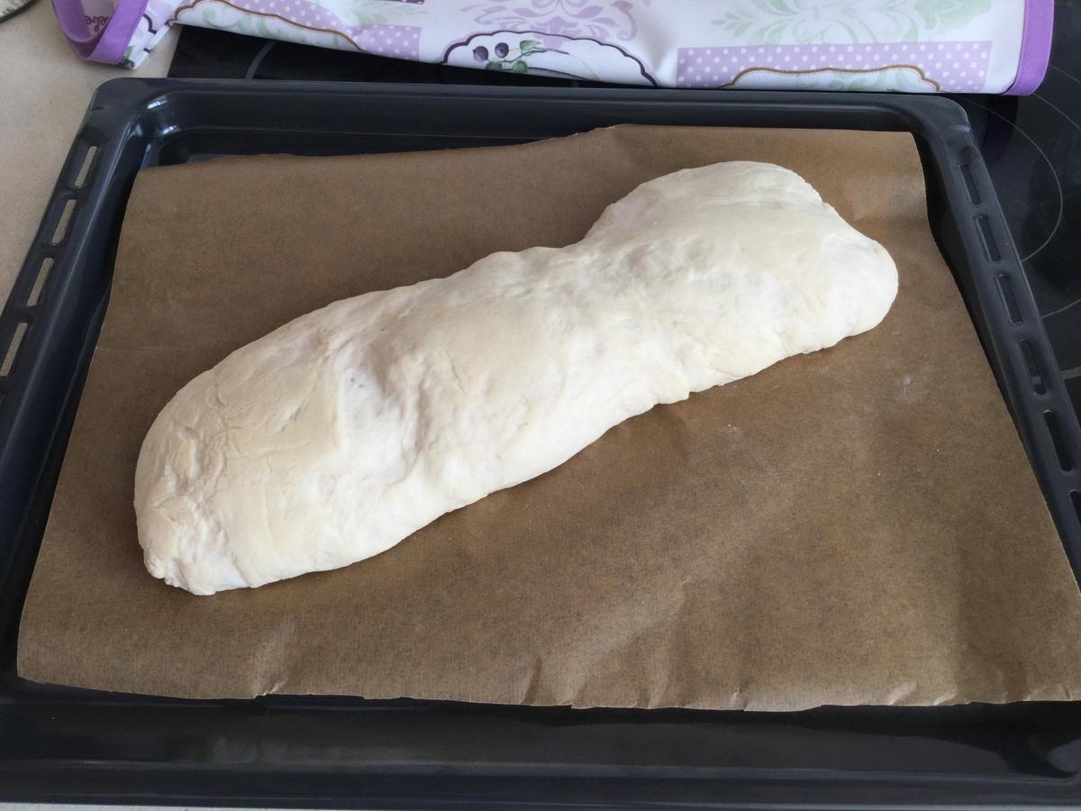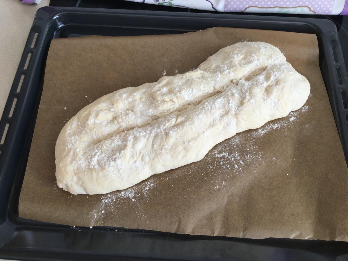 Truco: para que la masa no se desparrame hacia lo ancho aplanándose, en ambos lados y por debajo del papel de hornear ponemos un tope que haga que la masa se expanda hacia arriba y sus extremos. Y entre la masa y el papel de horno espolvoreamos harina para que no se pegue y al retirar los topes se estire a lo ancho.