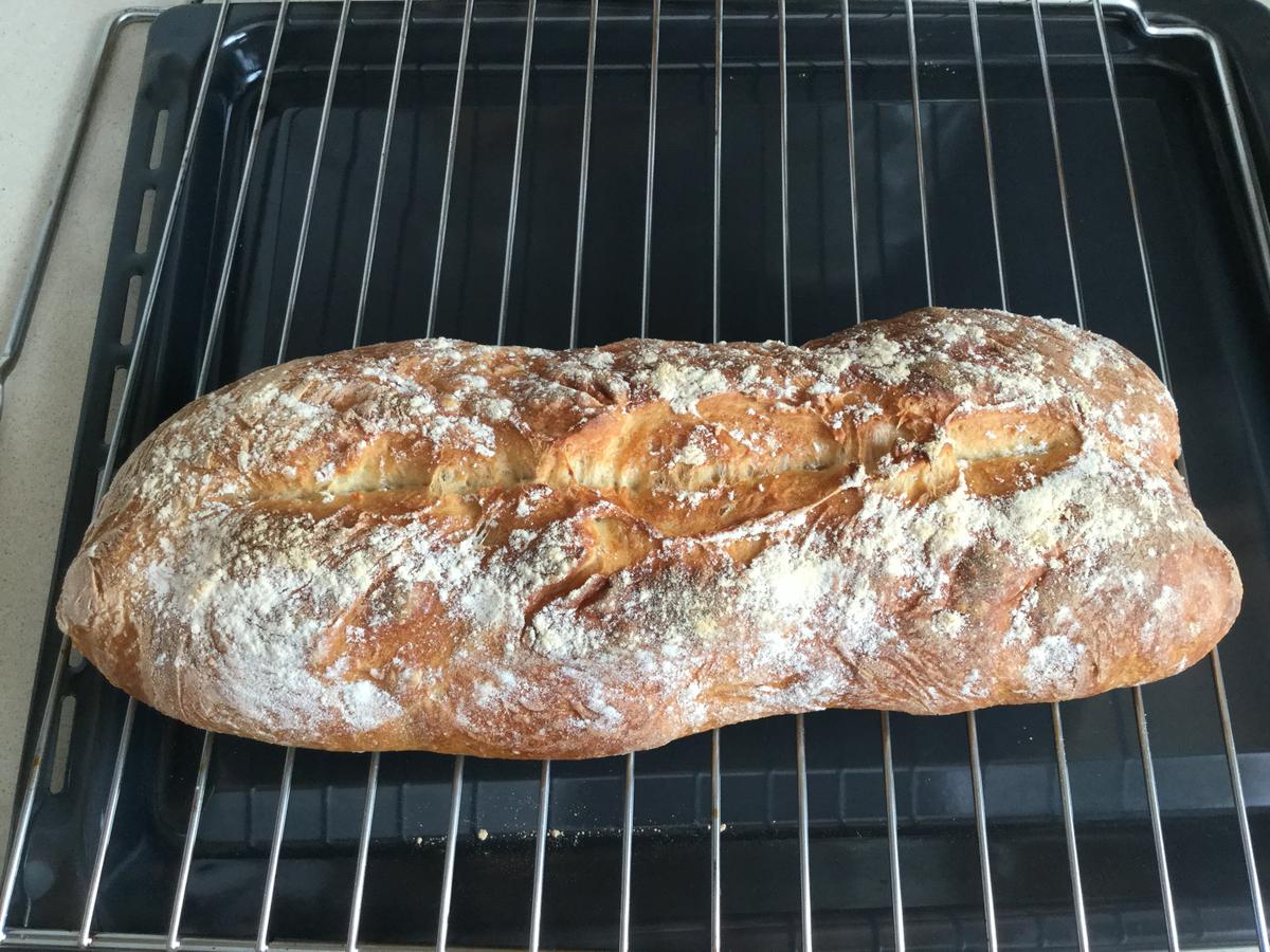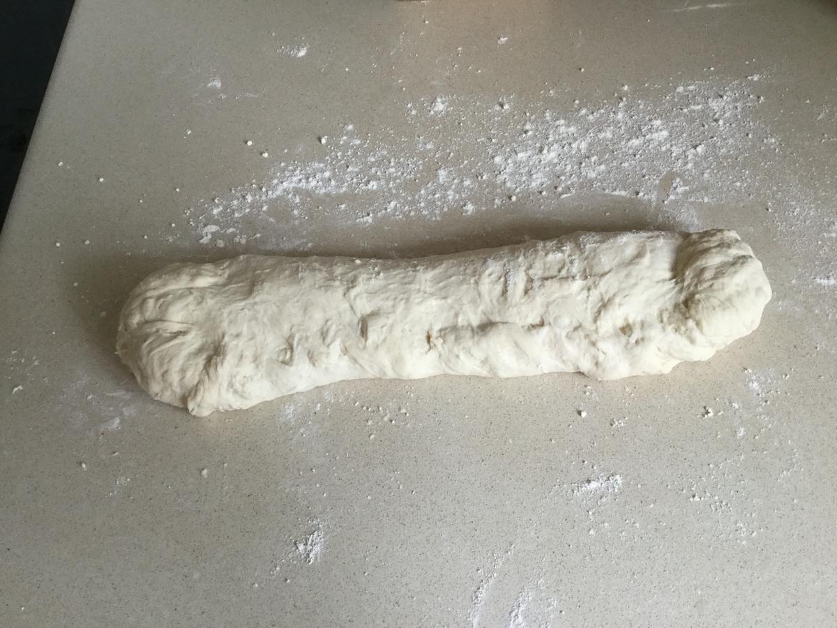 Transcurrida una hora, puede que un poco más, nuestra barra de pan ya ha cogido algo de volumen y el horno ha llegado a los 250 C. Así que vamos con los últimos pasos.