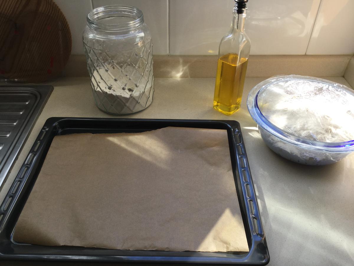 Aproximadamente, una hora o tal vez hora y media más tarde preparo el siguiente paso: cubro con papel de hornear la bandeja en la que voy a hacer el pan. Enciendo el horno a 250ºC, con calor sólo abajo y coloco sobre el fondo del horno una bandeja para que vaya tomando calor.