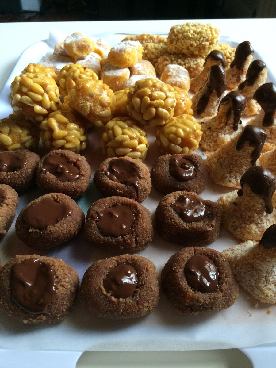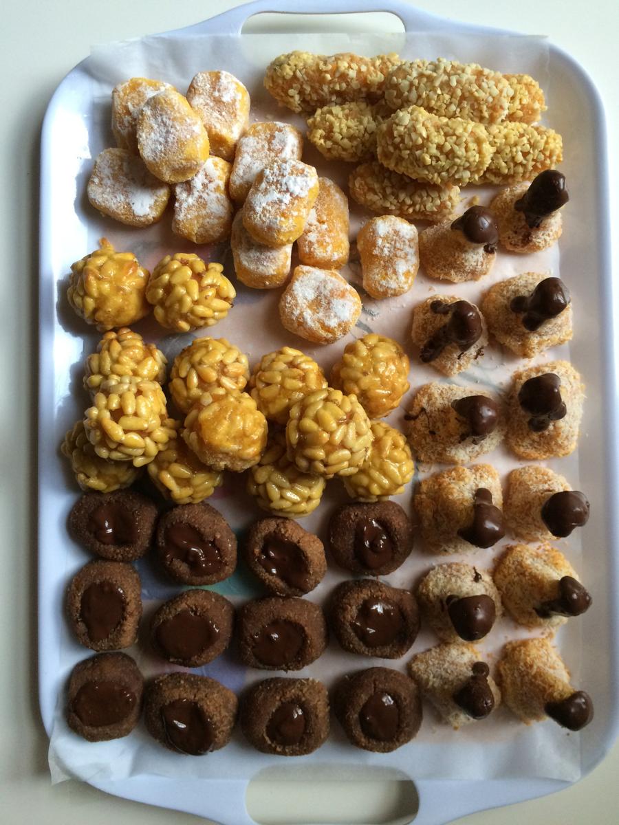 Fundimos un poco de chocolate y añadimos a la masa. Mezclamos bien y les damos forma redonda, aplastamos un poco y les hacemos un agujero. Los horneamos unos 5 min. Al sacarlos añadimos chocolate fundido en los agujeros.