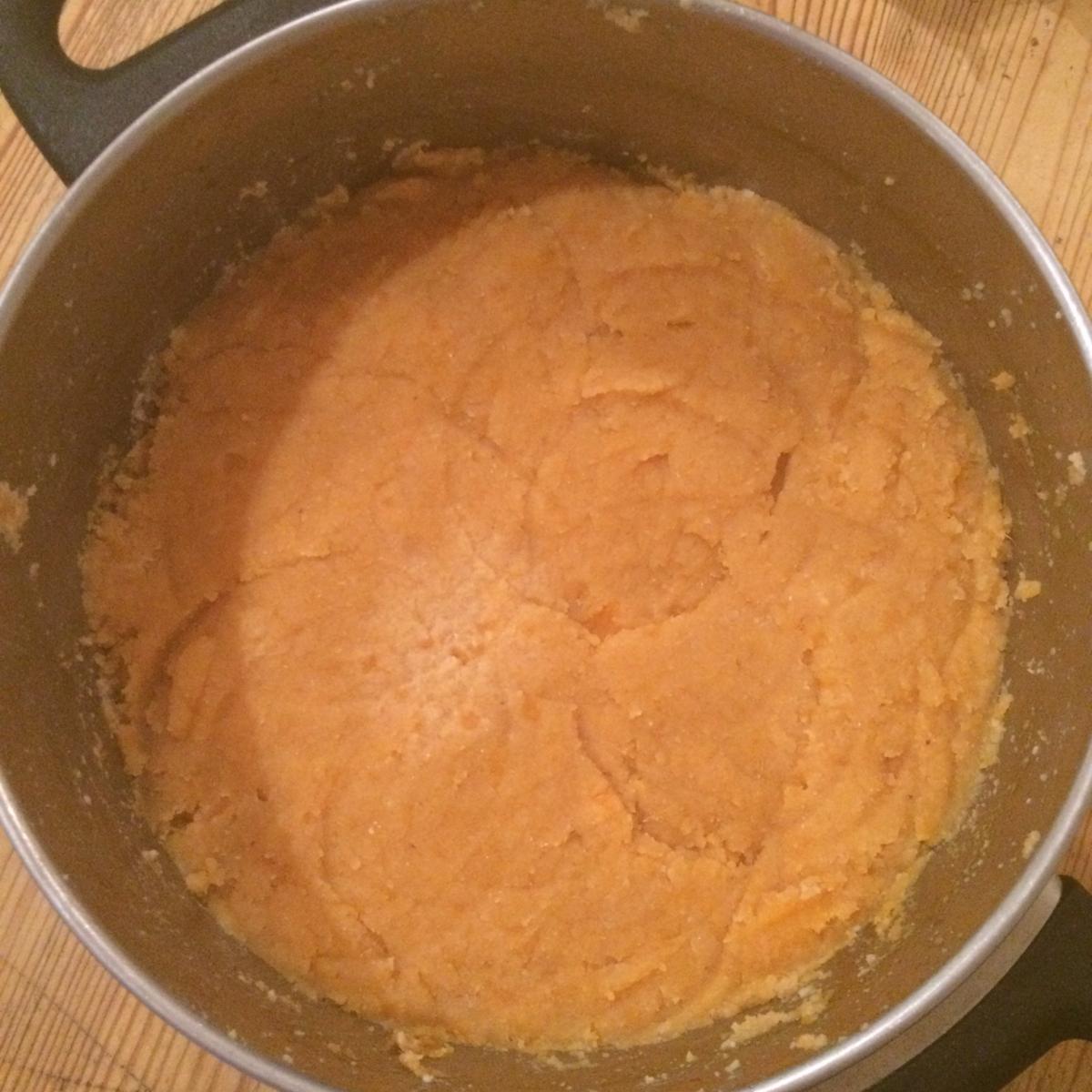 Mis cantidades han sido 460g de boniato, 460g de almendra molida y 230g de azúcar. Hervir el boniato (pelado a trozos), una vez blando, escurrimos y dejamos enfriar. Cuando está frío, mezclamos el azúcar y la almendra molida, hasta que tengamos una masa homogénea.