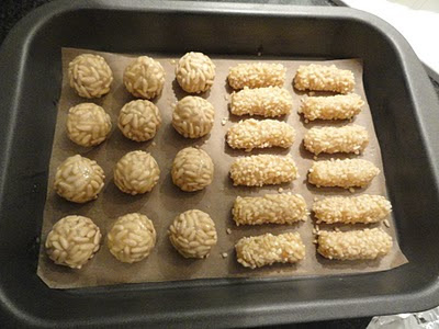 Empieza a hacer bolitas, luego rebózalas primero pasándolas por la clara de huevo y después por los piñones unas y por las almendras las otras. Ve depositando los panellets en la bandeja del horno cubierta con papel sulfurizado.