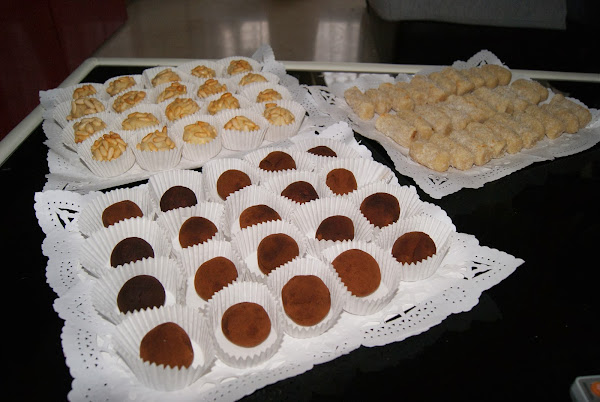 Piñones: en un plato ponemos dos huevos y los batimos. En otro ponemos los piñones. Hacemos bolitas con la masa, las pasamos por el huevo, y añadimos los piñones poniéndonos un puñadito en la mano, la bolita de masa encima y cerrando la mano para que se peguen con la presión.