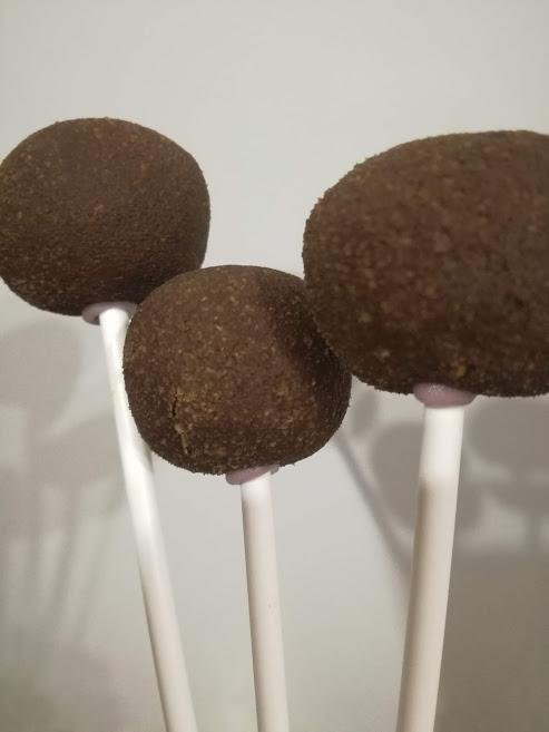 Luego, tomamos trozos de masa y hacemos bolitas con las manos. Cada cakepop debería tener unos 20 gramos aproximadamente, sería más ó menos, una cucharada sopera. Bañamos la punta de un palito para chupetin en chocolate derretido, y lo pinchamos en la bolita. Los palitos podes comprarlos en un cotillón o casa de repostería.