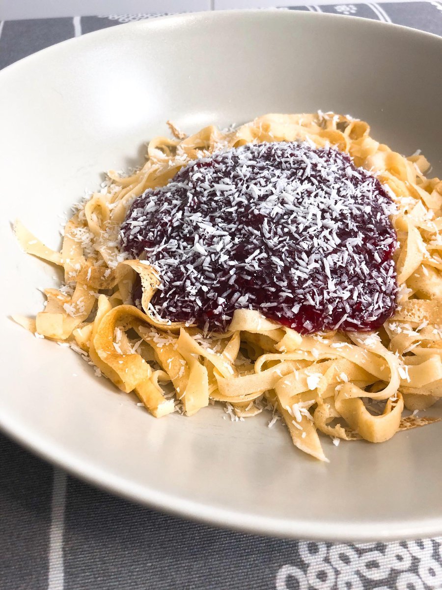 No, por lo que os estoy contando, aunque parezcan unos delicios tagliatelles a la bolognesa, ¡no lo son! Fijaros més en la foto. ¿Ahora sí? Son tiras de creppe con mermelada de frutos rojos y coco. ¡Una auténtica pasada!