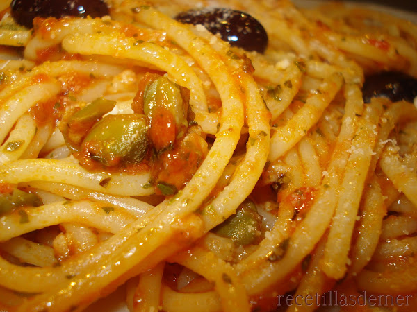 Sea como sea su origen, esta salsa es sólo apta para personas a las que les gusta el sabor fuerte puesto entre sus ingredientes, además de tomate, aceite de oliva y orégano, lleva alcaparras, anchoas y aceitunas negras. Incluso hay quien le pone un poco de cayena o guindilla, como hizo en Recetillasdemer