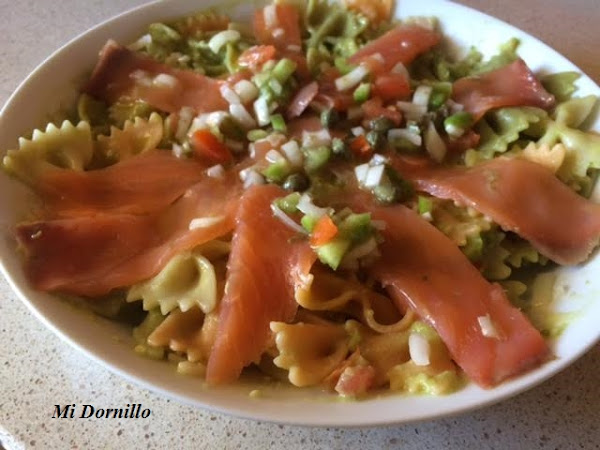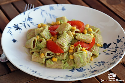 Cuando la pasta está lista escurrimos bien, y mezclamos con la salsa de aguacate, y servimos con unos cacahuetes por encima.