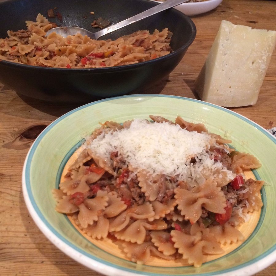 La receta de pasta con salsa de ternera que os traigo hoy es muy fácil de preparar como deliciosa. Es una receta hecha con pasta tipo lazos con una salsa hecha de pimientos, cebolla, tomate y ternera picada. Es un plato de lo más completo, saludable y original.