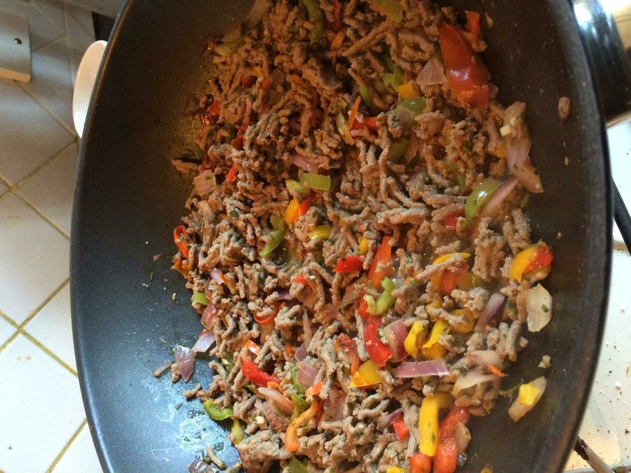 Una vez los pimientos estén hechos añadiremos la carne, que removeremos hasta que coja color. Como podemos ver en la image de abajo. Ahora añadiremos la leche y dejaremos cocinándose hasta que evapore. Una vez no quede líquido añadiremos el vino blanco, removemos y esperamos que se evapore por completo.