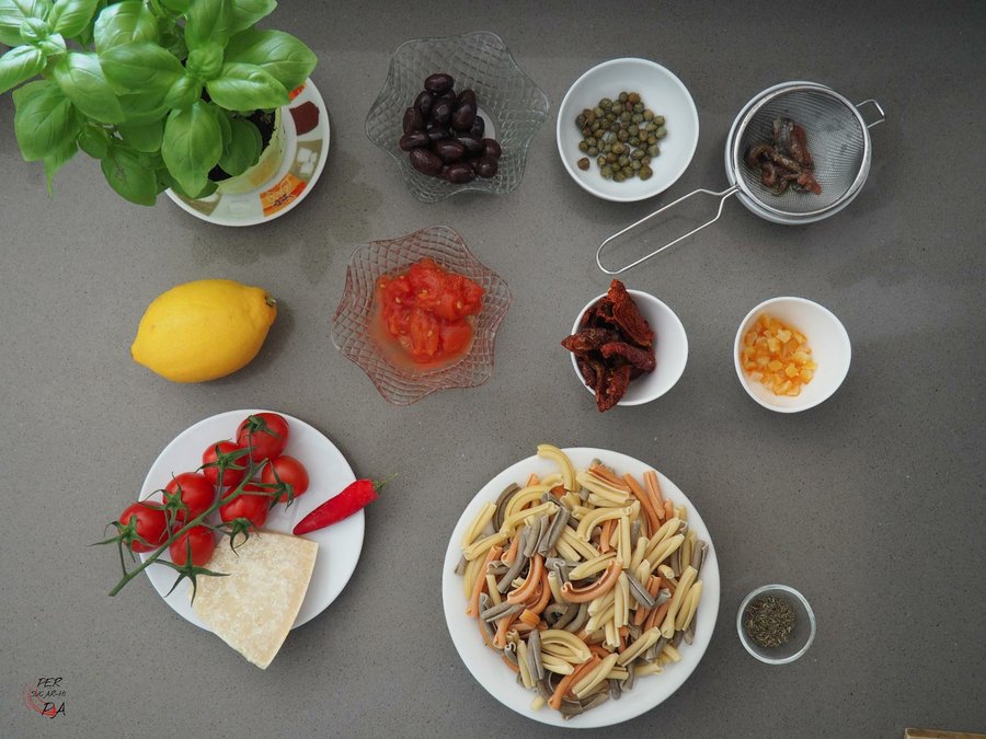Ingredientes para realizar la receta de pasta con salsa mediterránea: