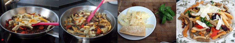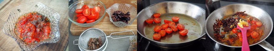 En una sartén al fuego poner una cucharada de aceite y cuando esté caliente marcar los tomates cherrys. Añadir el resto de ingredientes: el tomate aliñado y los tomates secos, las olivas y las alcaparras escurridas, las anchoas y la naranja confitada. Dejar cocer unos minutos, sin que los tomates pierdan la forma, Cortar el chile y añadirlo por encima.