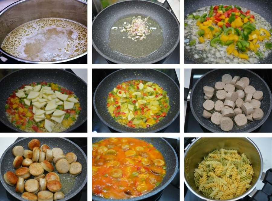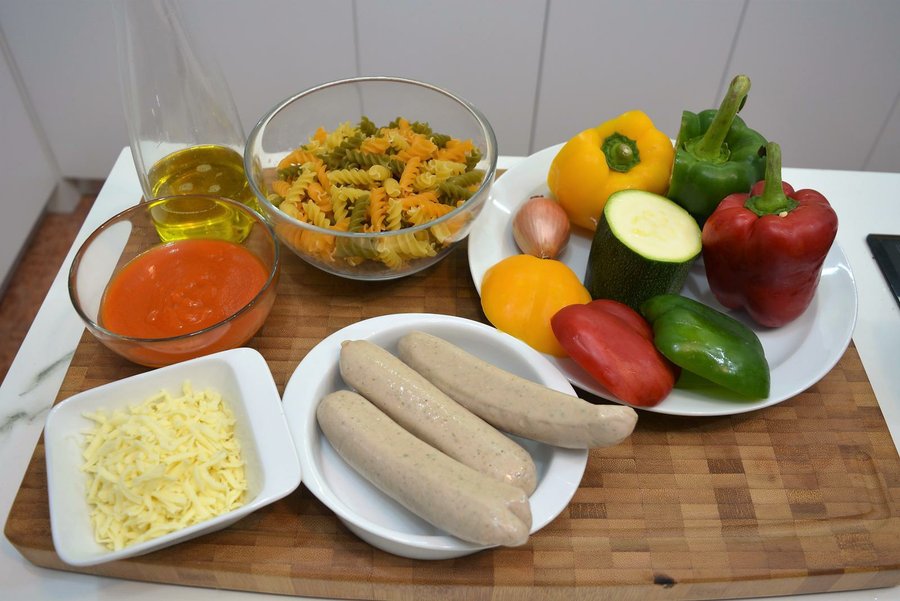 Pasta con verduras y salchichas bratwurst, ingredientes para 4 personas: