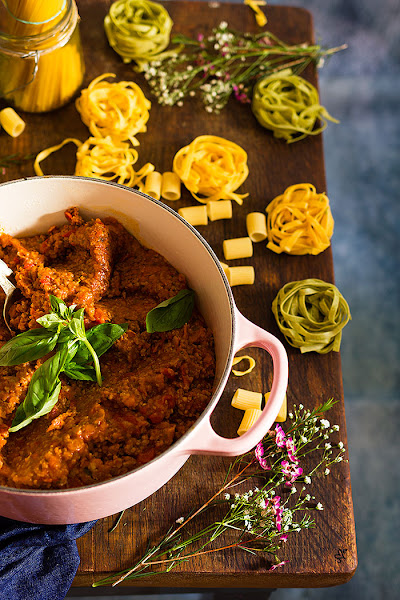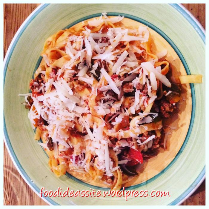 La salsa es ligera y nos aporta todo lo que necesitamos en una comida ya que lleva carne que nos aportará proteina, verduras y con la pasta obtendremos el carbohidrato. He hecho una adaptación de la salsa ragú italiana que se hace con carne picada, tomate… y la he hecho un poco al gusto, para variar, al final de ragú solo tiene que lleva carne picada y el método de cocción.