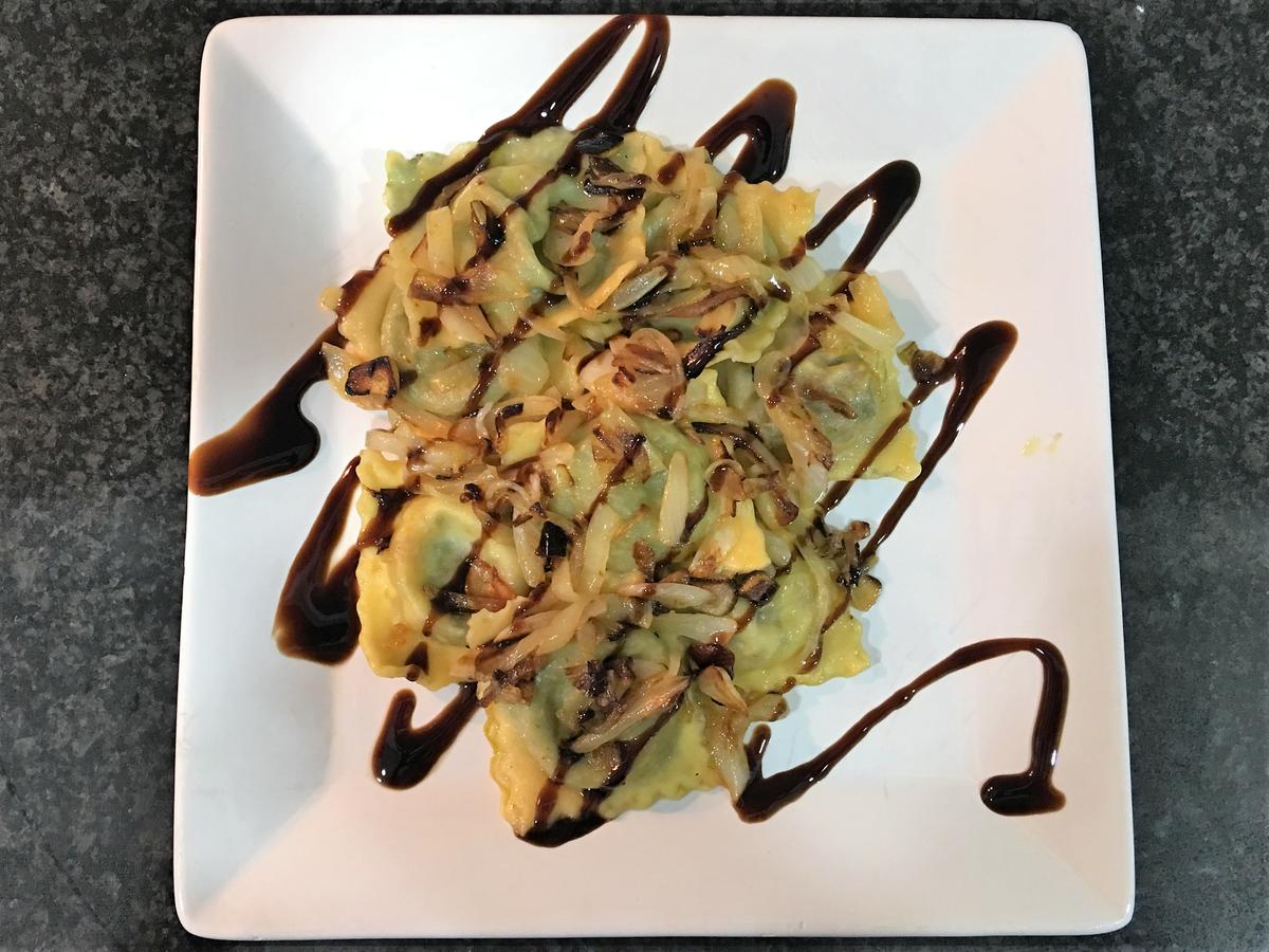 Pasta fresca rellena de espinacas, mozzarella y jamón ibérico
