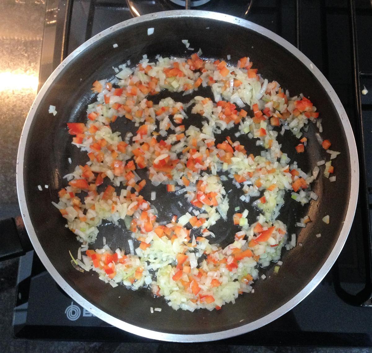 Paso 3: En una sartén pon un poco de aceite y añade los ajos, la cebolla y el pimiento rojo cortado muy pequeño. Saltéalo.