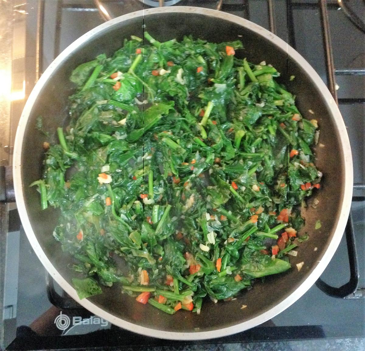 Paso 4: Ahora es el turno de las espinacas, añádelas cortadas pequeñitas y saltéalas hasta que estén totalmente pochadas. En el último momento añade el jamón cortado a dados muy pequeños.