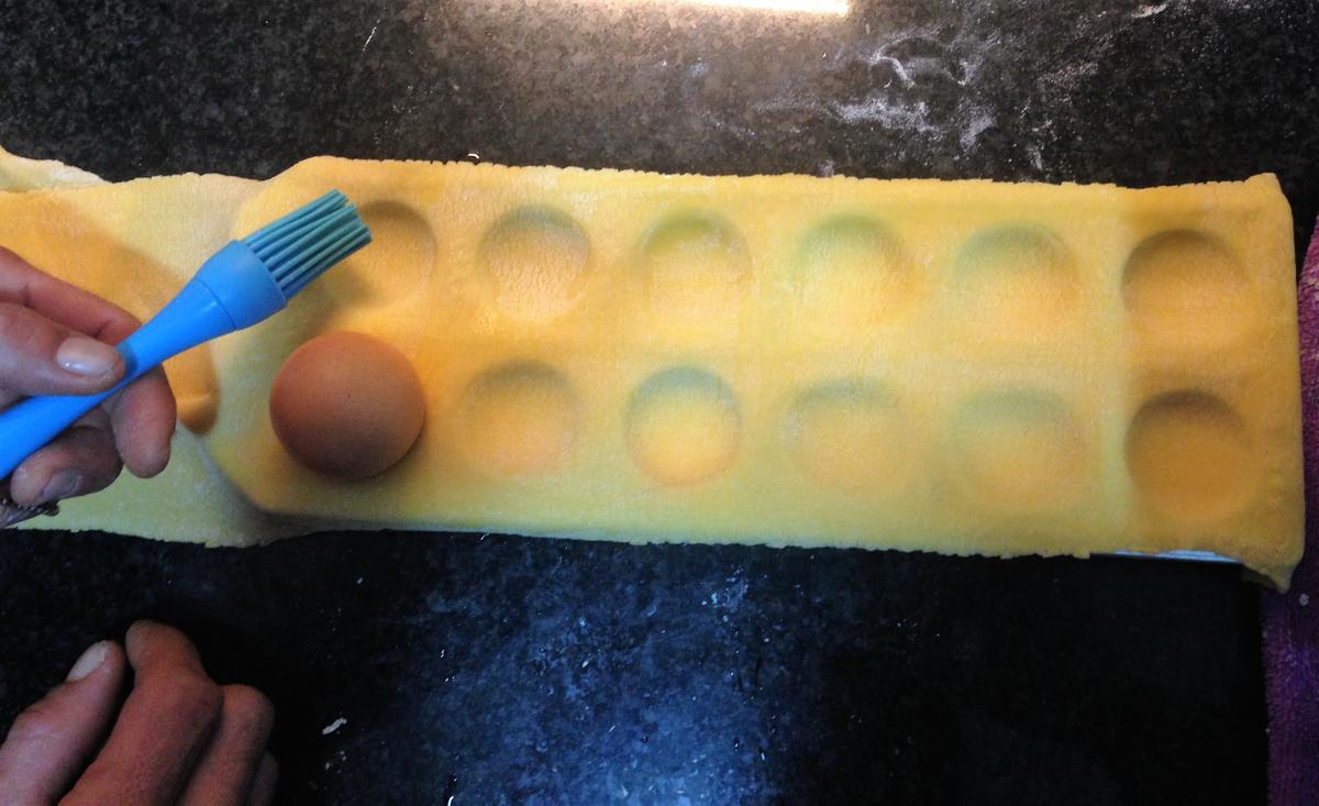 Paso 9: Con un pincel mojado en agua pinta los bordes del molde para que al poner la capa de pasta de cierre quede sellado. A continuación rellena los huecos con la masa de relleno y pon otra capa de pasta encima para cerrar los raviolis. Con la ayuda de un rodillo conseguirás al pasarlo por encima de la capa de cierre, que te quede bien sellado.