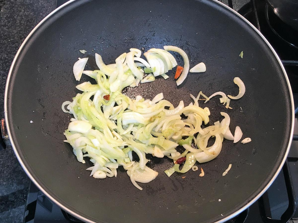 Paso 12: En una sartén pon un buen chorro de aceite y saltea los ajos, la guindilla y la cebolla cortado a juliana muy finito.