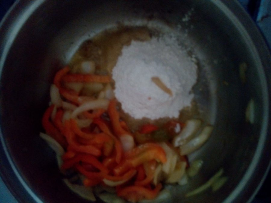 Cuando ya esten doraditos (a mi me gustán cuando llegan al punto de cristalinos), agregamos las dos cucharadas de harina y revolvemos vigorosamente para que no se pegue.