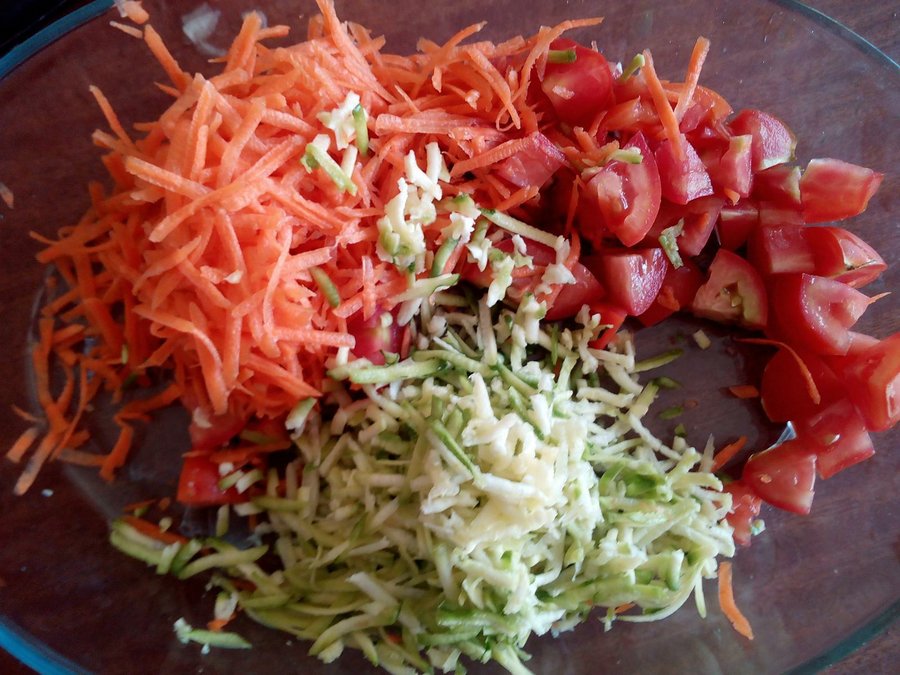 Cortamos en daditos los tomates, y rallamos la zanahoria y los calabacines.
