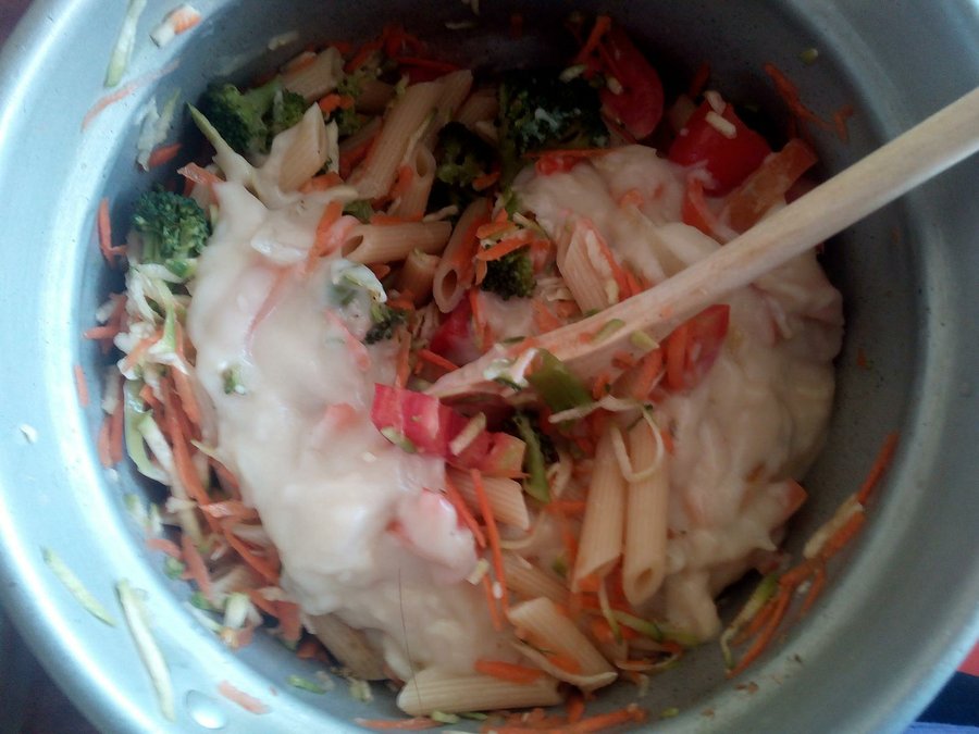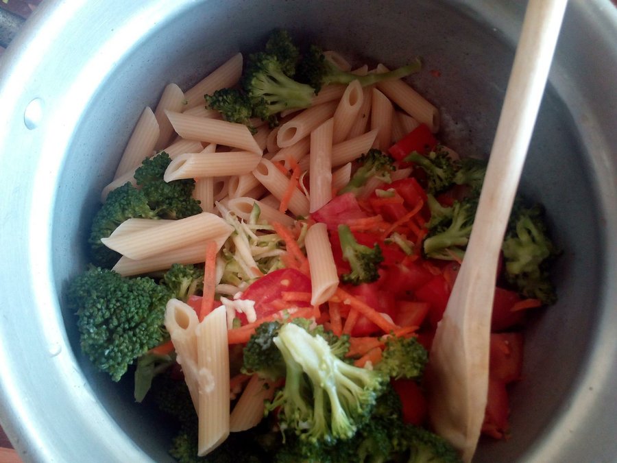 Cuando esté lista la pasta, la escurrimos y mezclamos los vegetales que rallamos y cortamos anteriormente, zanahoria, tomate, calabacines y brócoli.
