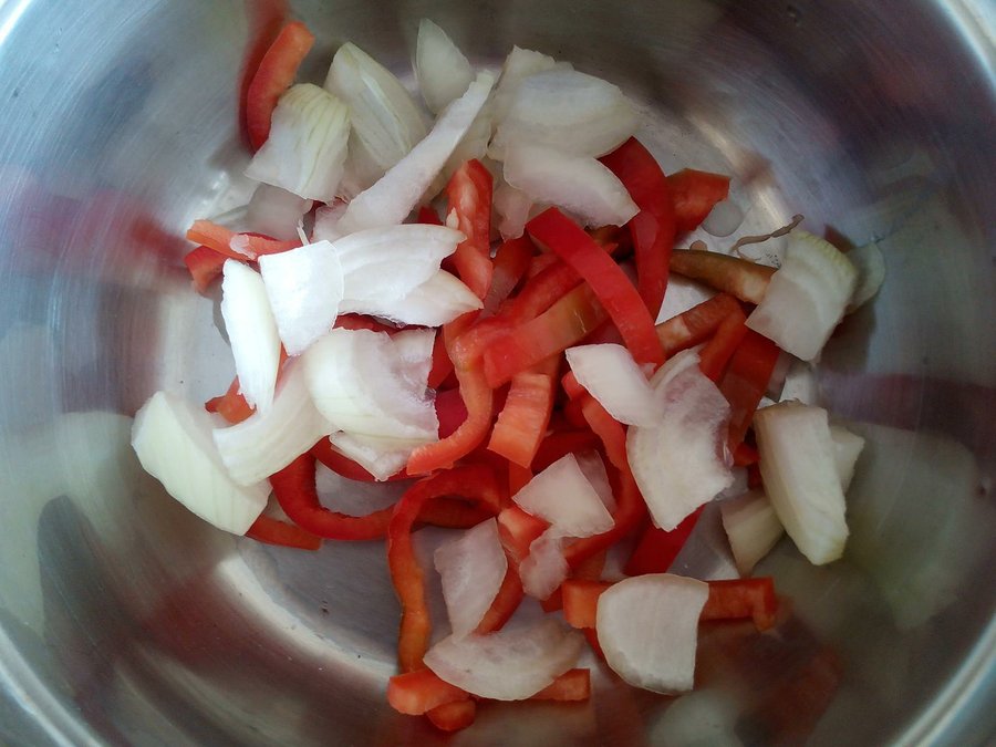 Mientras se cocina la pasta, colocamos en una sartén honda, la cucharada de aceite de oliva, la cebolla y el chile pimiento dulce a sofreir.