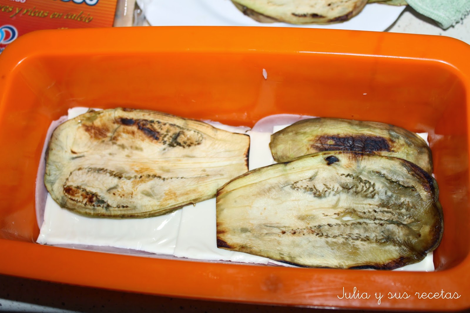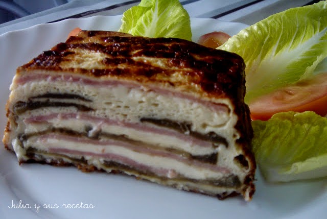 En un molde untado con mantequilla se pone, lonchas de berenjena, jamón york, queso, berenjenas, jamón york…. hasta completar el molde o se acaben las berenjenas.