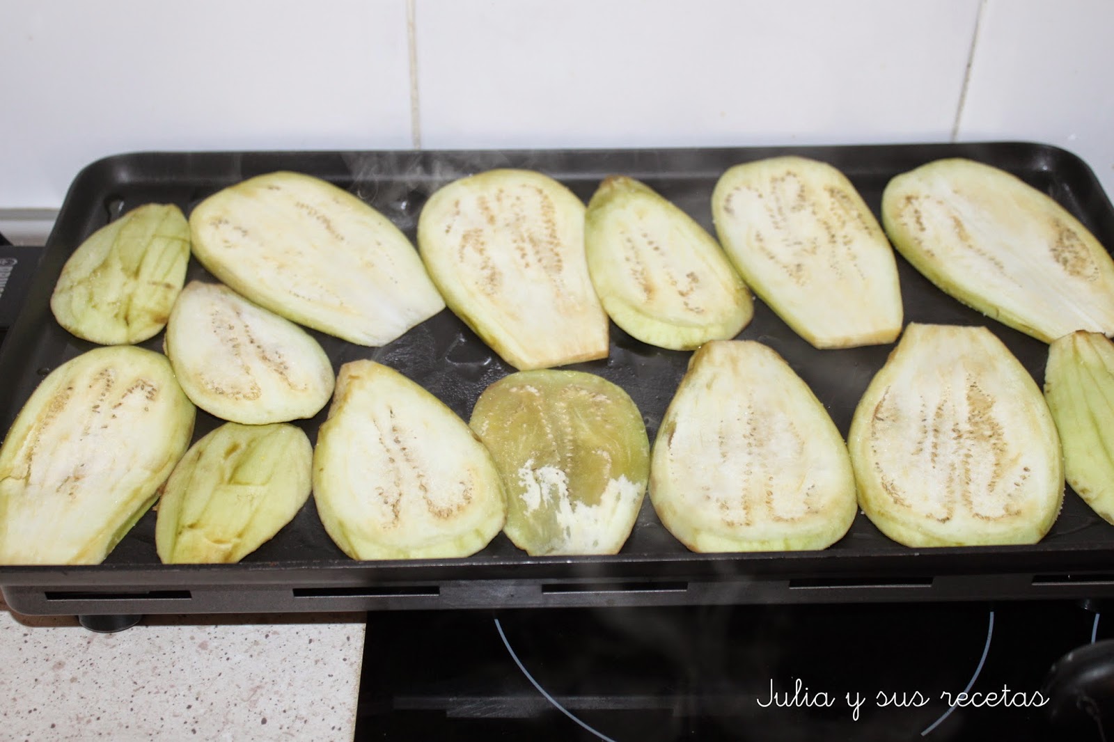Se cortan las berenjenas en lonchas y se fríen o se ponen a la plancha, o al microondas 8 minutos al máximo. Yo las pongo a la plancha.