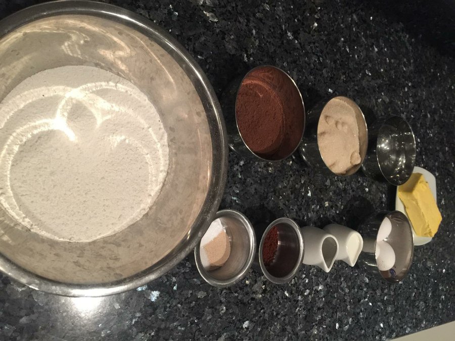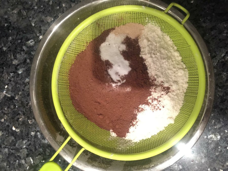 6. -Mezcla tus ingredientes secos harina, cocoa, sal, bicarbonato y polvo para hornear. Pásalos por un colador para que no queden grumos.