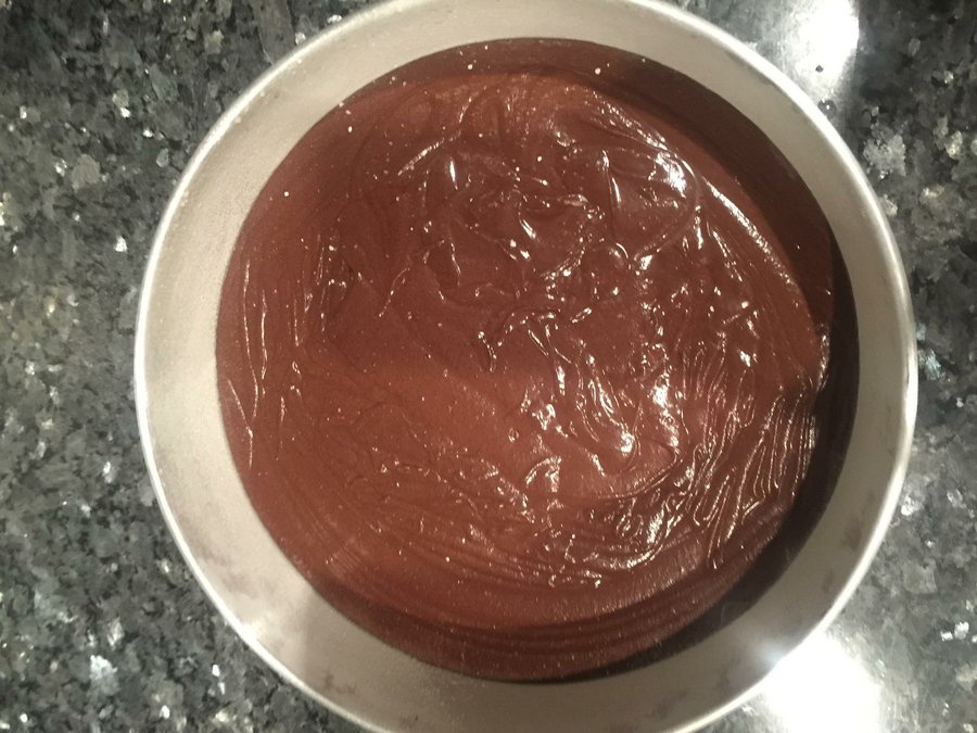8. - Con ayuda de una espátula de silicona pasa la mezcla a tu molde para pasteles preparado y golpéalo sobre tu área de trabajo, solo para eliminar burbujas de aire que queden en la mezcla.